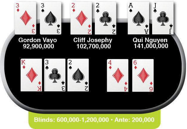 转牌是4♦。Vayo check,Nguyen也check。Josephy下注2100万。Vayo全压7510万筹码。Nguyen马上弃牌,Josephy跟注。双方亮牌,Vayo是3♦3♠,Josephy拿着2♦2♣,只有一张补牌(2♥)可以追。河牌是6♦,Vayo拿下了这个底池。