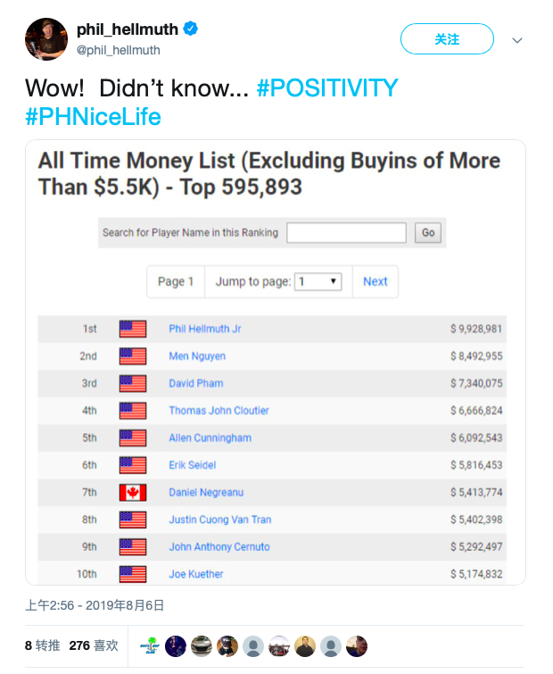 没过多久你就成为了全球扑克金钱榜的领头羊,Phil Hellmuth前不久发布了一条Twitter,炫耀自己是低于$5,500买入锦标赛中收入最高的玩家。我们在该条推特下看到了你的很多回复,你是如何看待那些认为豪客成绩不应该纳入职业牌手的评判范畴?