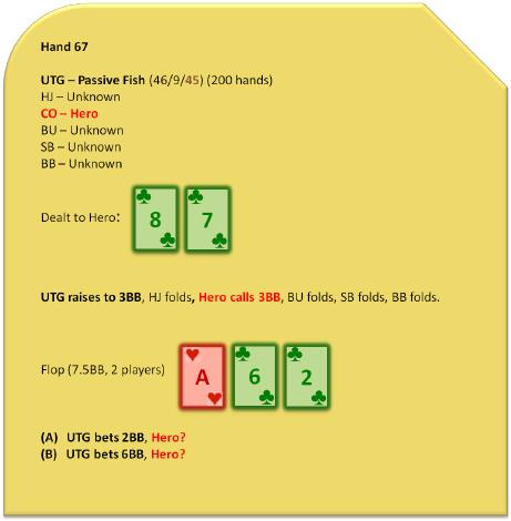 现在被动的牌手做接近底池大小的下注。如果没有理由认为对手属于“价值下注小而诈唬下注大”的类型,这个来自这种“不中即弃牌”牌手的下注也应该从表面来看待。这种牌手通常比看起来激进很多,因此他很可能不是诈唬。既然对手的范围很强,我们就几乎没有弃牌赢率。此外,对这个大额持续下注加注后被3bet将很糟糕。底池将大到相当于剩余有效筹码量的很大一部分。在这种场合潜在底池赔率将非常小,因为Hero追逐听牌的投资将大很多。