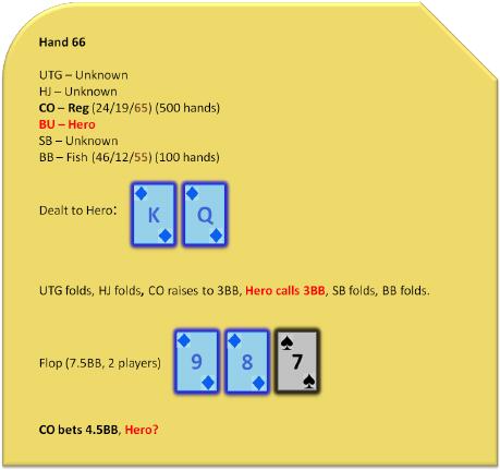 鉴于这个翻牌面非常凶险,我们假定对手在这里不会3bet诈唬。如果Hero具有对手可能诈唬的阅读,那么在翻牌圈对3bet全压产生的弃牌赢率与这手牌的胜率将迅速变得非常有吸引力。