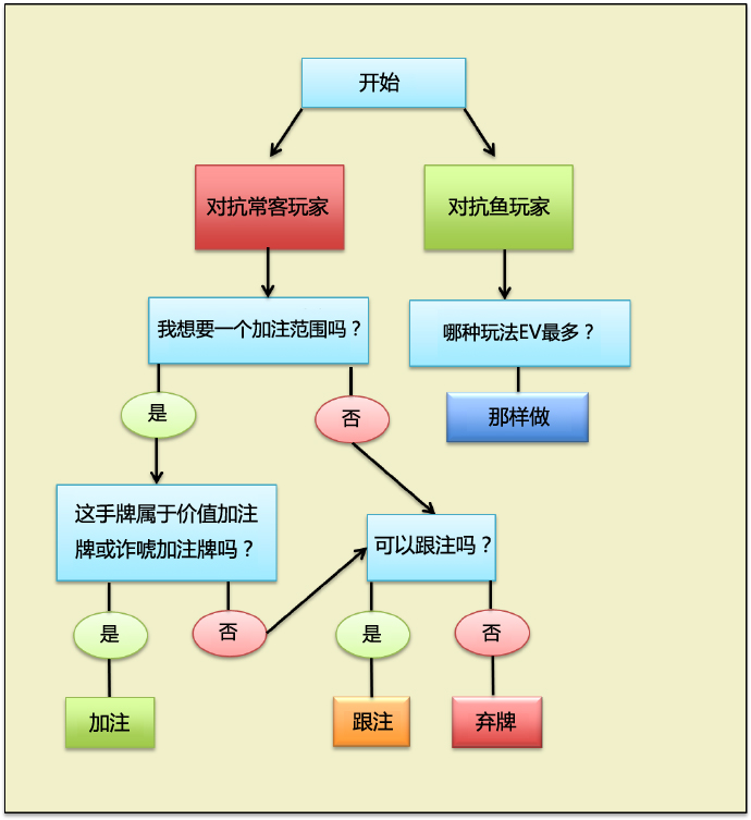 我们来看一张简洁的流程图,总结如何在一个开放行动场合的翻牌圈评估我们的牌。