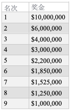 今年钱圈名额1286人,最低奖金$15,000,前72名选手的奖金高达六位数,前10名选手的奖金至少$800,000以上。下面是决胜桌玩家奖金分配数据: