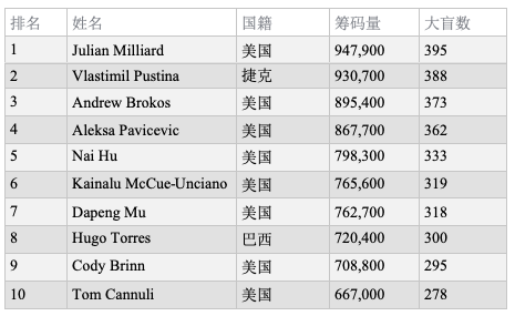 2019 WSOP主赛第二轮C组筹码量前10选手: