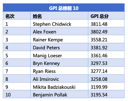 Anthony Zinno目前位居总榜第15名,他对于GPI来说不算陌生面孔,曾在2015年7月取得过榜单的第一名。