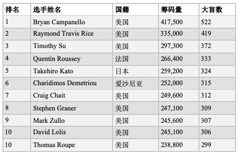 2019 WSOP主赛第一轮A组筹码量前10选手: