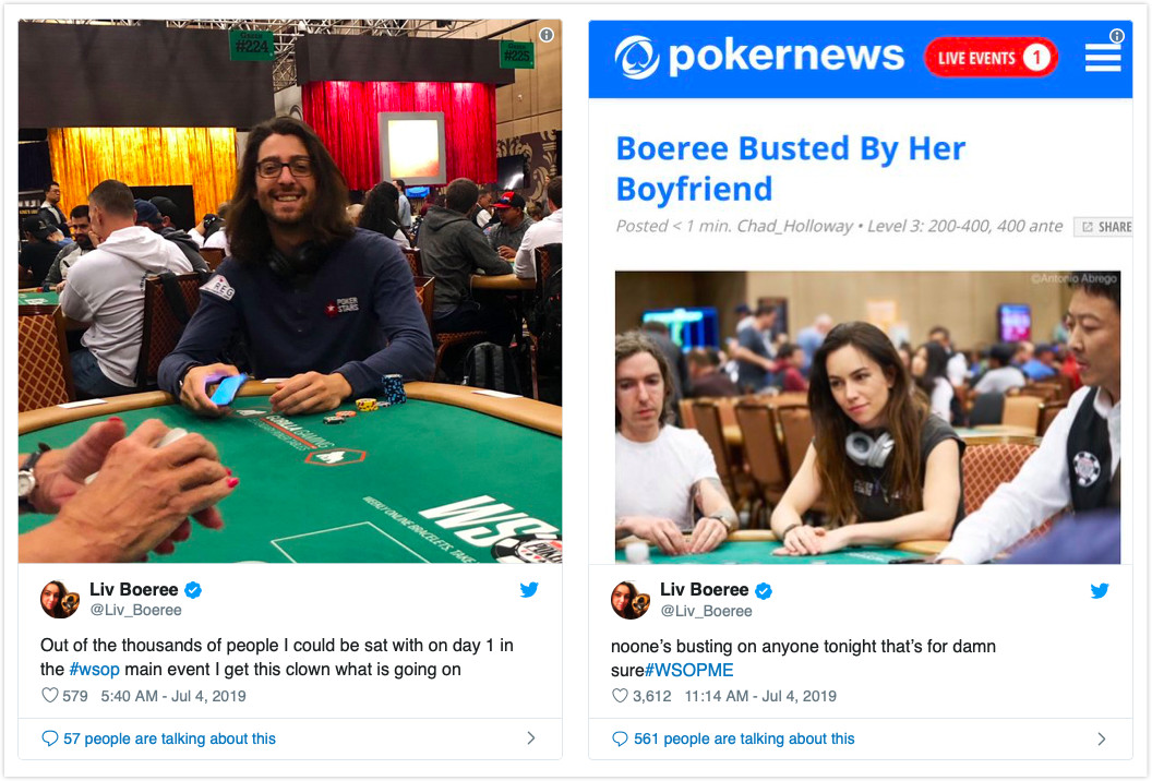 当天最吸入眼球的就是Liv Boeree的出局,在第三个级别中,Boeree拿着Ah-Jh全下,其他人都弃牌了,唯独位于大盲位的Igor Kurganov进行了跟注,正面和女友杠上了。Kurganov后来对自己的决定说,“我需要抓住这次机会,否则后面可能再也碰不到了!”