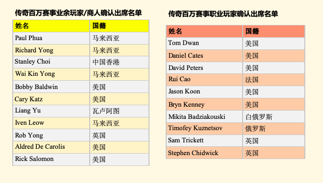 目前确认出席的业余玩家包括:传奇扑克合伙人Paul Phua,中国香港大投资人Stanley Choi,DTD娱乐场老板Rob Yong,四条WSOP金手链玩家Bobby Baldwin。(这四人虽然是业余玩家,但牌技一点都不在职业玩家之下。)