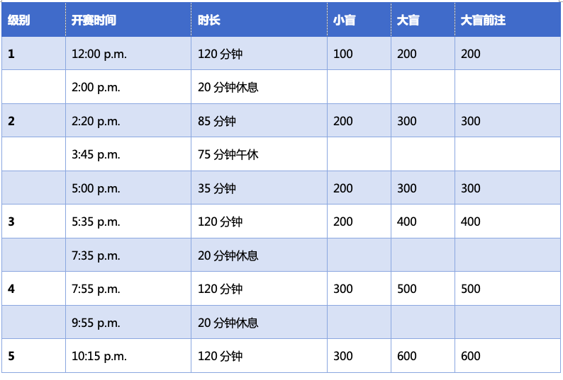 玩家起始筹码60,000,共5个级别,每级别120分钟。每个级别之间有20分钟的休息时间,第二个级别的午休为75分钟,上半场85分钟,下半场35分钟。报名截止时间为Day2开赛之前,Day1a结束后未出局的选手晋级Day2ab。