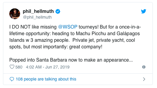 “WSOP最宠爱坏男孩”的确有点坏,四大天王其他3人均在现场,唯独他不见身影,太不给WSOP面子了。很多人都好奇他去哪了,说出来挺让人嫉妒的,溜出去玩了。代替领奖的是他的经纪人Brian Balsbaugh,随后Hellmuth发布推特表达了他获奖的喜悦和未能到达现场的原因。(推特大意:我真的不愿意错过WSOP这样的历史时刻。但我也不愿意错过和三位有趣的人一同去马丘比丘和加拉巴哥群岛的机会。私人飞机,私人游艇,壮丽的风景,最重要的是有一群了不起的小伙伴。)