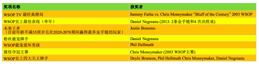 7个奖项采取的是网上公开投票,从5月15日到6月15日。(“50位最了不起的扑克玩家”名单采取的是26人投票组投票)。