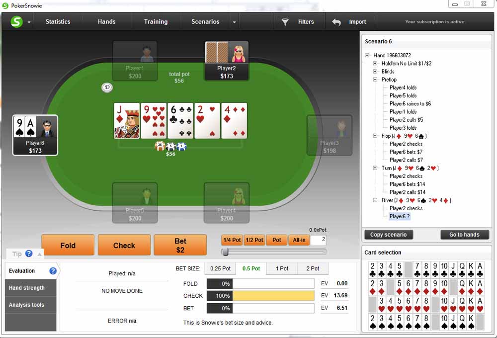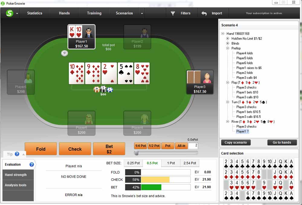 我们看到PokerSnowie建议在58%的时候随后check,在42%的时候价值下注。这张8♥并非我们在河牌圈特别想看到的牌,因为它完成了一些听牌,而且构成了一些两对,但在这里随后check并非必然的选择。即使河牌有点儿恐怖,你应该仍然能够在一定百分比的时候做薄价值下注。
