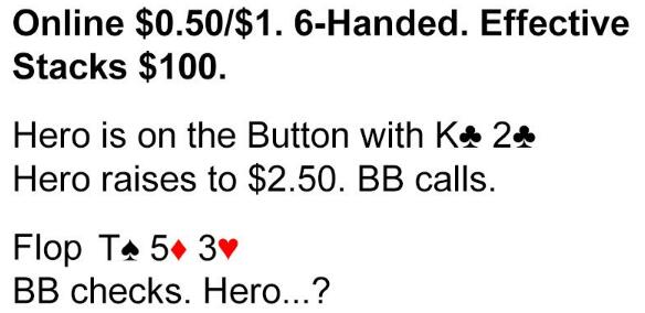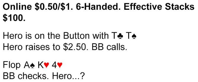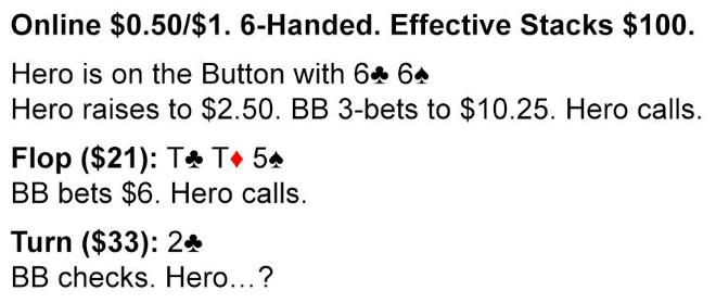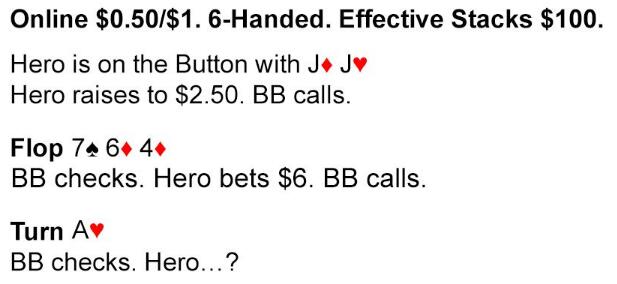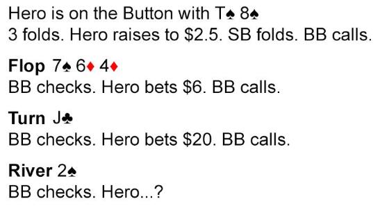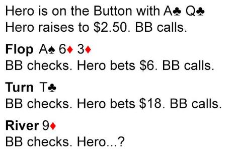8. 你的牌在转牌圈和河牌圈不足以强到为价值而下注,这意味着它在这种场合最适合check。你可以指望在大多数河牌面通过跟注抓诈唬,或者在大盲玩家再次check时主动寻求价值。
