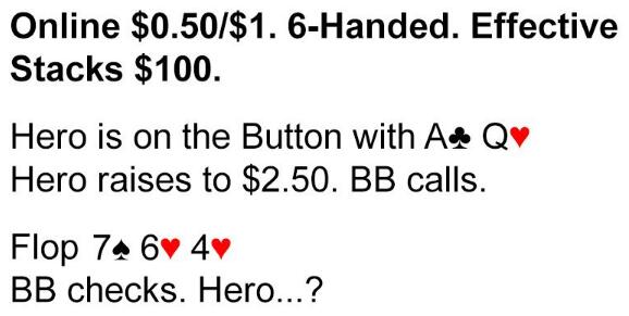 5. 下注是一个次好选择,因为这个翻牌面与大盲玩家的防守范围联系紧密。你无法通过下注拒绝太多底池权益。而且,你是投入资金到一个极不可能赢得的底池。除此之外,你应该用这手牌看一张免费的转牌,因为它留住了大盲玩家更差的Ax牌和Qx牌,改进了你的潜在底池赔率。例如,当你在转牌圈击中一张Q时,你将能够赢得Q9这样牌的一两个下注,而这手牌本会在翻牌圈对下注弃牌。