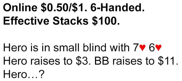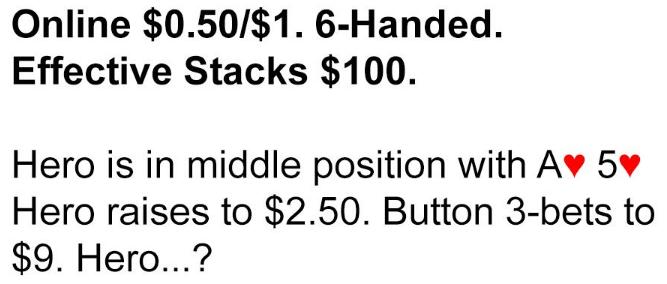 2. 76s在小盲对抗大盲场合对抗一个好牌手可以轻松跟注。它具有很好的可玩性和相当的胜率,特别是对抗一个较宽的大盲范围时。4bet是一个比较合理的选择,但你通常应该用具有良好阻断牌的牌那样做(比如上题中的A5s)。