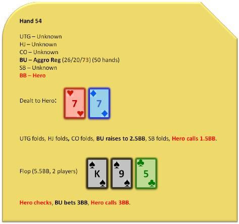 在接下来的几手牌中,HUD统计数据的第三个数字(棕色)是CBet Flop(翻牌圈持续下注频率)。