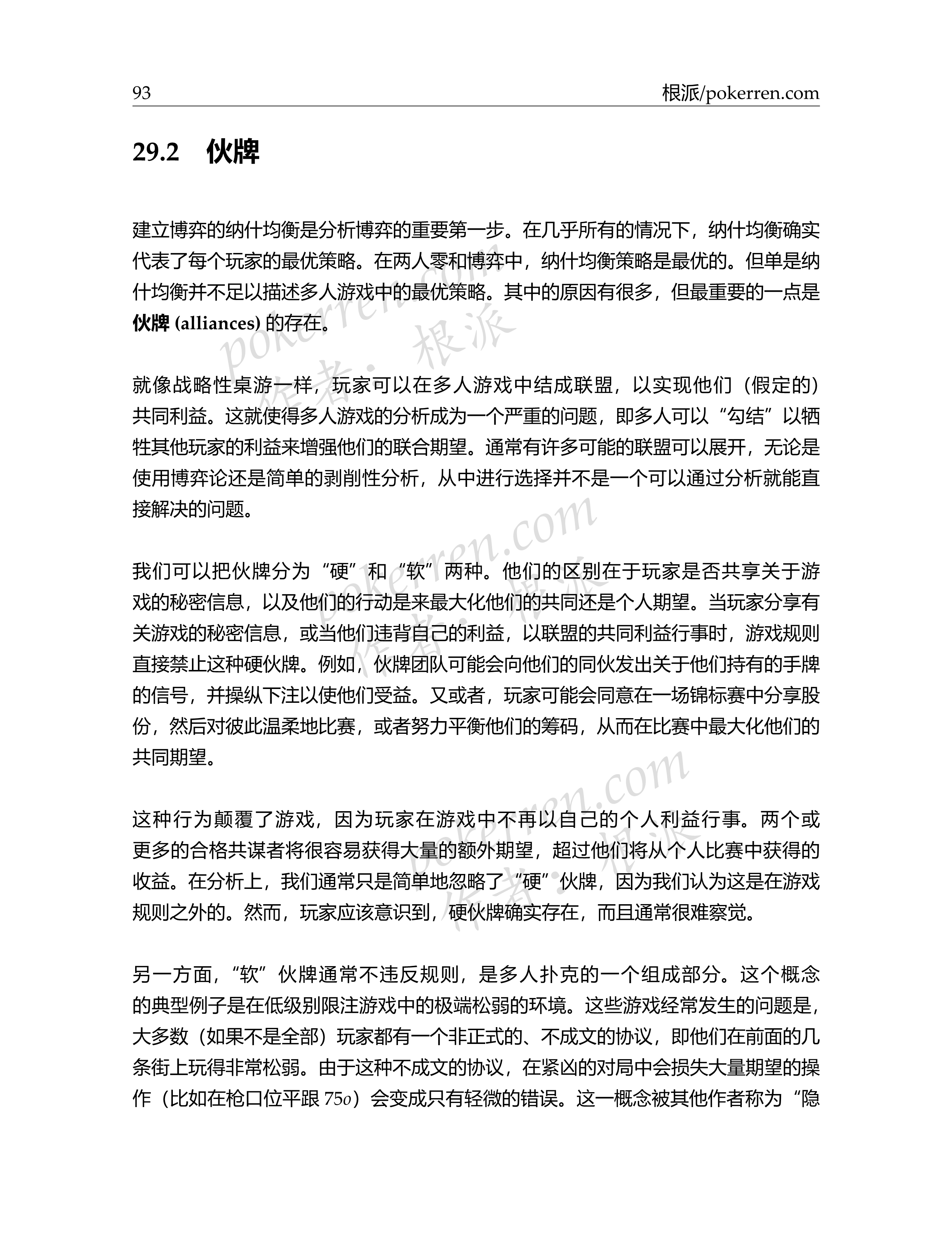 建立博弈的纳什均衡是分析博弈的重要第一步。在几乎所有的情况下,纳什均衡确实代表了每个玩家的最优策略。在两人零和博弈中,纳什均衡策略是最优的。但单是纳什均衡并不足以描述多人游戏中的最优策略。其中的原因有很多,但最重要的一点是伙牌(alliances)的存在。