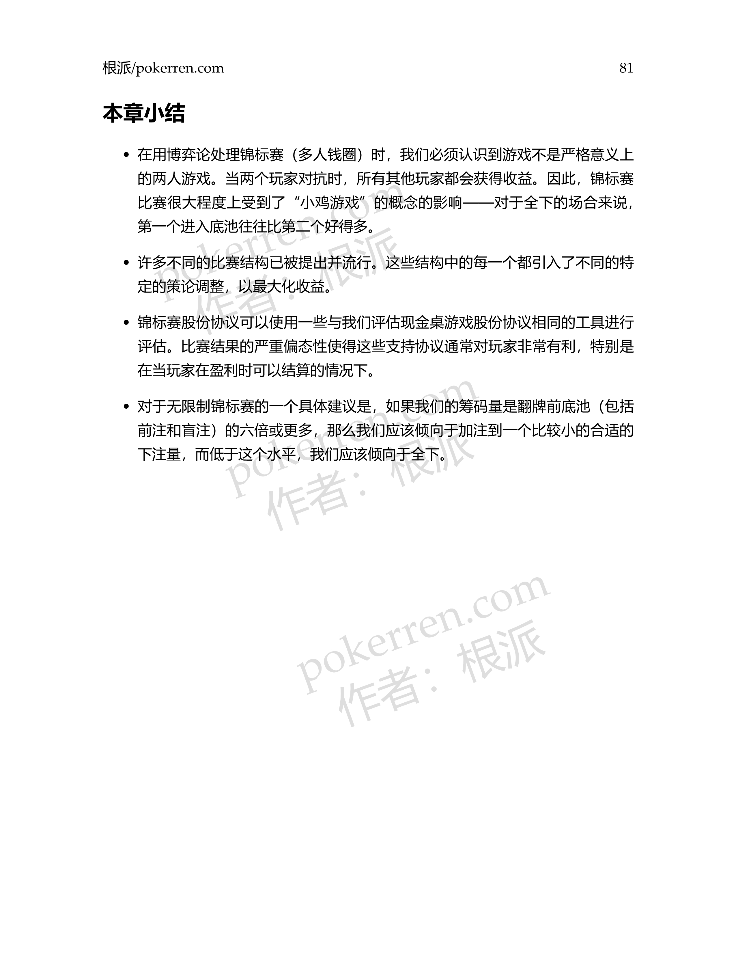 在用博弈论处理锦标赛(多人钱圈)时,我们必须认识到游戏不是严格意义上的两人游戏。当两个玩家对抗时,所有其他玩家都会获得收益。因此,锦标赛比赛很大程度上受到了“小鸡游戏”的概念的影响——对于全下的场合来说,第一个进入底池往往比第二个好得多。