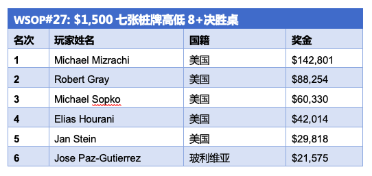 尽管Jan Stein是决胜桌筹码量最少的选手,但率先出局的选手却是Jose Paz-Gutierrez,这位玻利维亚人在和Michael Sopko交手中惨遭出局,获得比赛第6名。