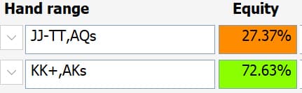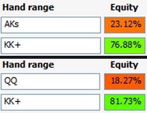 对抗只包括AA和KK的4bet范围(这在现场扑克中并不少见),用QQ和AK继续游戏是一个大错: