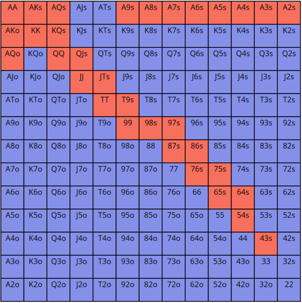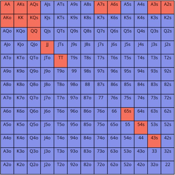 注意:这里给出的调整后3bet范围只是一个短期内构建的、用于说明的示例,远非完美。你也许可以用更多牌不受惩罚地3bet,比如AJs-ATs,同花大高张,KQo或AJo。