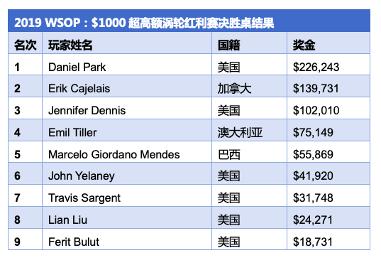 2019 WSOP $1,000超高额涡轮红利赛吸引了2452人报名,奖池高达$1,471,200。最终的冠军是来自纽约38岁的Daniel Park,收获$226,243奖金和个人第一条金手链。