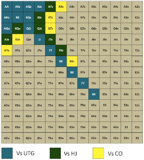 当我们面对后面位置的率先加注范围时,弱牌变成了可玩牌,但要注意差距概念在这里起到很大影响。Hero选择对抗每个位置率先加注的范围比他自己选择在那些位置率先加注的范围紧很多。这是一种良好的做法,且确保跟注牌有足够多的潜在底池赔率(如66)或常见牌力(JTs)去弥补位置劣势。