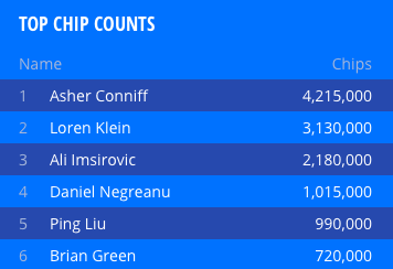 从开赛到6人决胜桌共经历12小时,丹牛目前筹码量排名第四,领先的是Asher Conniff。同时入围的还有实力派选手Ping Liu和豪客职业玩家Ali Imsirovic。