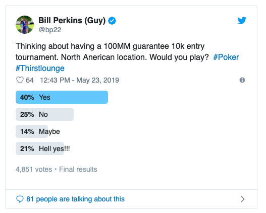不得不承认扑克圈才是最不缺钱的地方,而且这个行业的人各个都很会玩,这个领域的人最擅长的就是变着花样的玩。传奇前脚宣布将在伦敦举办100万英镑买入锦标赛,Bill Perkins后脚就表示自己想举办一场1亿美元保底奖池的锦标赛。这位身价不菲的对冲基金经理对扑克如痴如醉,虽然自己特别想举办这样一场比赛,但还是有点犹豫,所以跑到了推特上搞起了民众投票。