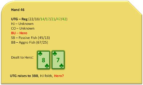 在牌例45中,因为牌桌上没有鱼玩家,87s是一手简单的弃牌。这里我们有一个不同的局面,两个盲注玩家都可能参入进来,而且当他们这样做时玩得很糟糕。这种翻后局面对我们是极有利的。Hero的同花连子作为一手投机牌不像口袋对子那样强,因此为了投入3BB他需要额外的潜在底池赔率。相对Hero处于不利位置的两个鱼玩家提供了很好的潜在底池赔率。