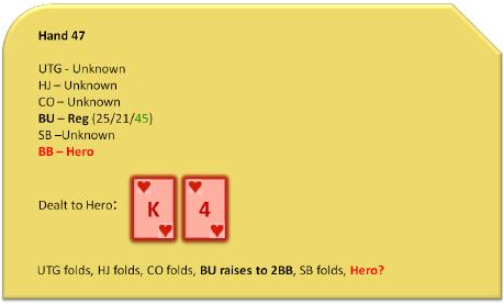 因此,我们的结论是,牌例47是一个因为第四个理由(底池赔率使得通常比较边缘的牌成为了可跟注的牌)跟注的好场合。我们翻后的表现不是很好,但我们为了拒绝弃牌按钮不需要很好的翻后表现。我们只需要好过略多于1/5的时候赢下底池的假想情况。