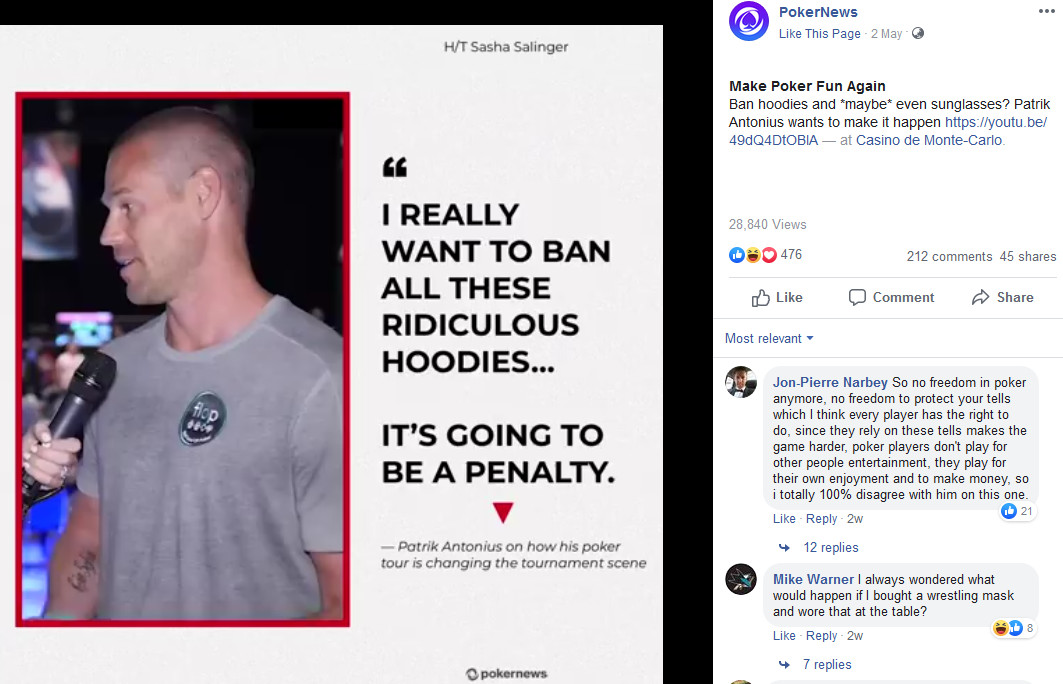 Antonius接着指出在线下扑克赛场上玩家穿戴帽衫和其他配饰的问题。很多扑克玩家都喜欢穿有帽子的衣服,衣服本身其实没什么问题,真正的问题在于很多玩家都喜欢将自己的脸藏在帽子里。没去过牌场看到过这类现象的人可能会觉得很好笑很有趣,但如果你真正坐上牌桌打牌你就会发现这类人很讨打,特别是牌局进行直播的时候。