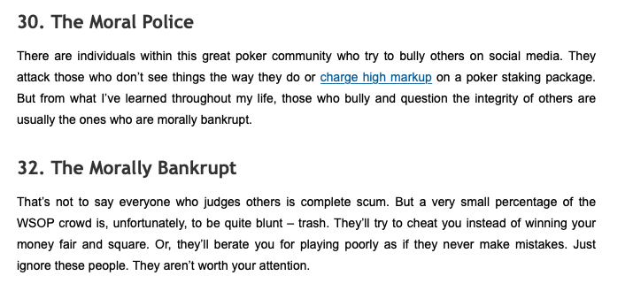 扑克圈总有一批人喜欢在社交媒体上对他人进行道德批判。比如批评某人不该要求一个高溢价出售自己的买入份额。其实只要没有干涉到其他人,人家爱做什么都是自己的事,没必要对人进行道德绑架。(没有第31类,哈哈,)