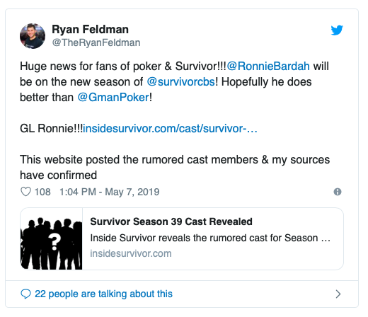 扑克圈知名制片人Ryan Feldman日前在推特上向自己的关注者公布了新节目的选手阵容。他肯定的告诉大家Ronnie Bardah就是新一季《幸存者》的参赛嘉宾。