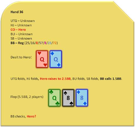 如我们所知,发现自己拿着一手足够价值下注的强牌后,Hero的下一个任务是评估他是否需要做大底池。我们作为翻前加注者拿 着一手强牌可以在一个回合check的最主要原因,是有效筹码量已经小到足够在平常少一条街的情况下打光资金。换句话说,我们多出一个打造底池的回合。但要牢记,这本身并非check的理由,我们也需要认为check相比下注有更高的EV,而且问题3的回答是“是”。