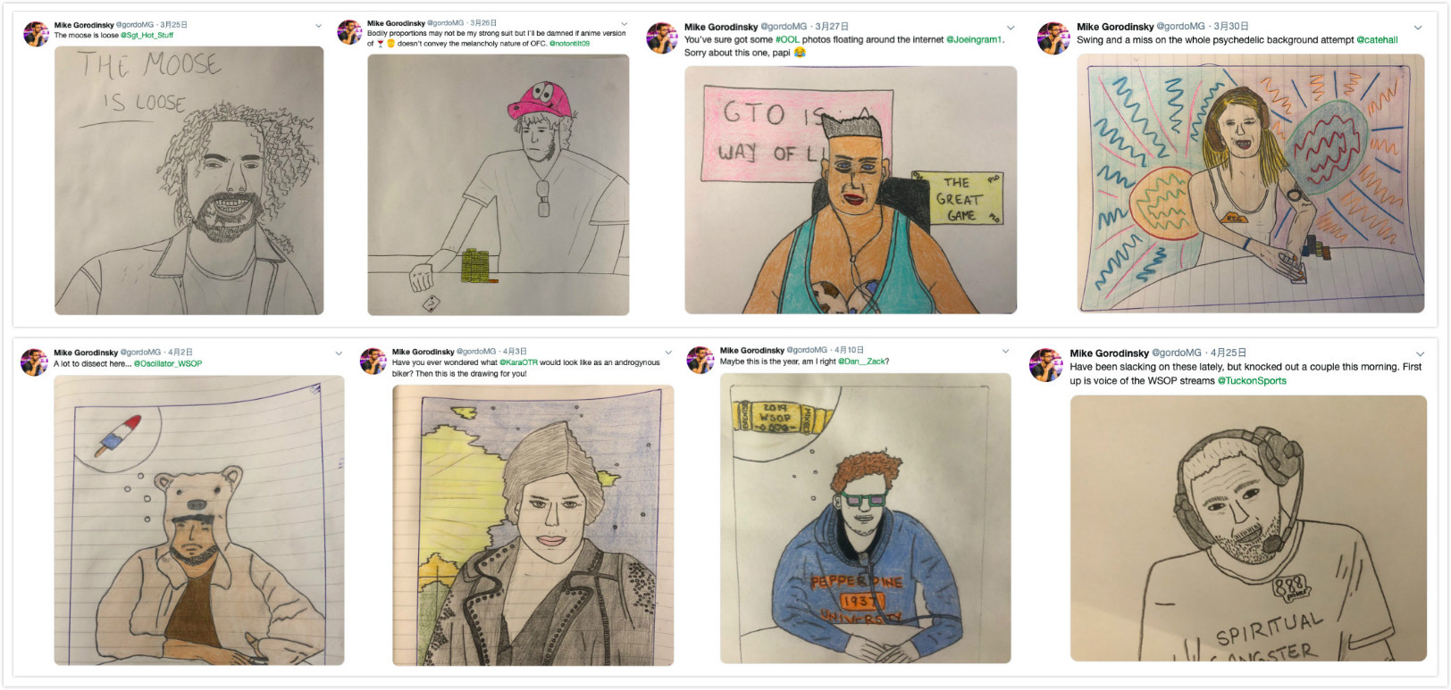 Mike Gorodinsky是一位扑克玩家,一位出生在圣彼得堡且拥有两条WSOP金手链的玩家。就在一个月前,Gorodinsky发现自己内心有种强烈的绘画欲望需要被释放,于是一些知名牌手就成为了他画笔下的“小白鼠”。Gorodinsky的画风是怪异的,虽然有些人说他不具备艺术家的天赋,但从作品来看还是充满想象和个人风格的。