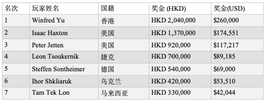 官方决胜桌为7人,Jordi Urlings是进入钱圈的非决胜桌选手,也就是比赛的第8名,获得奖金HKD 260,000 ($33,800)。
