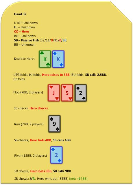 大多数时候,当Hero冒险在某一回合让底池停滞发展时,他是在犯错。只要有效筹码量非常深,底池往往需要不断增长。我们来看看两个不同的Hero拿着相同底牌对抗同一对手的两手牌。在牌例31中,hero是一名老练的牌手。在牌例32中,Hero是一个初学者。我们来看看两者的差异。