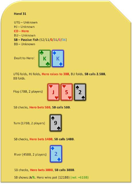 如果对手特别差劲,为了弥补他之前所犯的错误,Hero甚至可以考虑在河牌圈做超过底池大小的下注,但这是获取价值的不太可靠的、愚蠢的方式。我们应该预计即使跟注站型鱼玩家也对这种超额下注频繁弃牌,因为他们得到的价格将非常糟糕。在每个回合使用大而非巨大的下注循序渐进打造底池的路线是在这些场合最大化EV的最好方式。牌例31应该是对抗弱手如何用强牌价值下注的一个极好的例子。