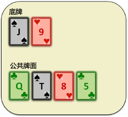 就绝对牌力来说,我们仍然有一个顺子,因此我们仍然有一手经常能取胜的牌。但是,相对于这个具体的公共牌面,我们的牌非常弱。因为任何带黑桃的底牌都拿到了同花,而不那么重要的是,QJ和J7已经拿到了更好的顺子,我们的牌往往比对手差。就价值下注来说,我们很难得到差牌的跟注,因此我们的牌力相对于对手的继续游戏范围(如果我们下注)是非常卑微的。我们对于流程图第一个问题的回合是“否”,我们无法在这种场合价值下注。