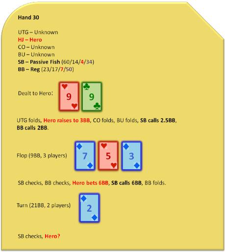 l 当Hero在同花完成的公共牌面展示更多力量时,常客玩家应该在这个转牌面放弃许多一对。因此Hero在转牌圈被跟注时难以领先。