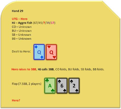 对抗这种类型的对手这手牌应该check-call。如果对手很凶,那么Hero甚至可以计划check-call整个三条街,对于他范围中的弱Ax牌,为了榨取最多的价值,他也应该采用相同的游戏方案。事实上,Hero应该考虑用所有他可以跟注一个下注的牌check,让过分凶的对手在这里下注。在关于价值下注的下一章将有何时为了榨取价值而采用被动玩法的更多例子。