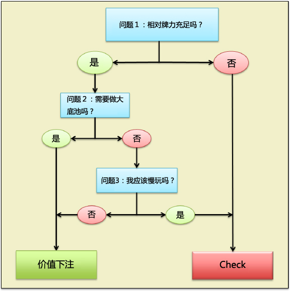 下面的流程图应该成为Hero在考虑一手潜在价值下注牌时的决策制定准则。蓝色矩形方框代表用于判断我们进入上述哪种情况的问题。我们对于这些问题的“是”、“否”回答指引我们去正确的方向。现在研究这张表格,并思考这些问题的含义。我们将对他们进行逐个详细讨论。随后我们考虑我们的下注尺度,结束本章的学习。