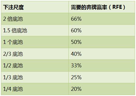 以下表格列出了在忽略胜率情况下不同下注尺度需要的弃牌赢率(RFE)。