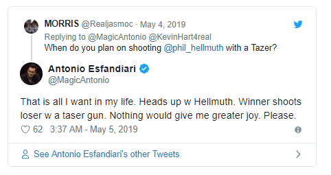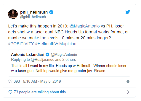 魔术师Esfandiari日前在一场拳击对赌中赢了对手喜剧演员Kevin Hart,他一直幻想着自己拿着泰瑟枪追着Phil Hellmuth跑的画面。看情况似乎他能很快得尝所愿,但也有可能是Hellmuth拿着枪追着他跑。Hellmuth推特大意:让我们在2019年把这件事办了吧:魔术师Antonio对阵PH,输了的人将被泰瑟枪电击。我偏爱NBC的单挑模式,或者也许我们可以自己制定赛制,10分钟或20+分钟一个级别?