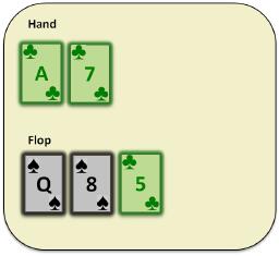 情况1-按钮玩家 vs 大盲玩家:我们处在有利位置,而且我们的后门同花听牌,后门卡顺听牌和高牌应该使是持续下注是可行的。