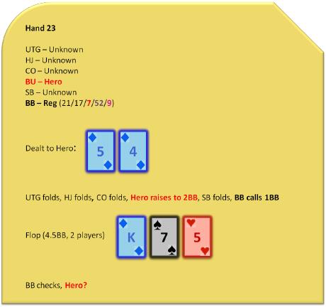 我们再回到牌例23。Hero确实是用一个极宽的范围率先加注,而且翻牌面极干燥。他的持续下注绝对应该比较小,但具体多小呢?