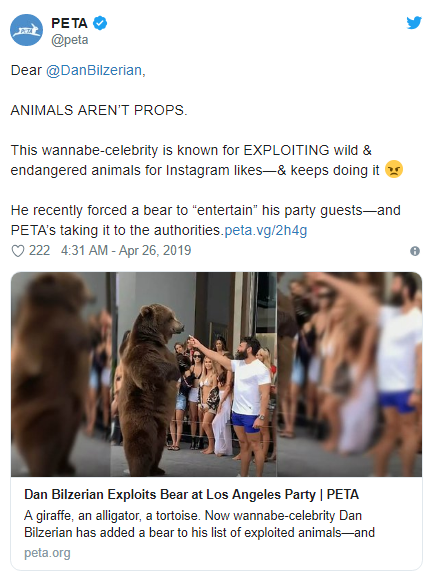 4月20日,扑克花花公子Dan Bilzerian在个人Instagram上传他在私请宾客群前喂食一头巨大的科迪亚克棕熊的短视频,可这很快遭到了善待动物组织(People for the Ethical Treatment of Animals,PETA )的竭力抵制。该动物权益组织表示这位社交媒体达人“剥夺”了动物自身的快乐并以法律诉讼的手段警告他。