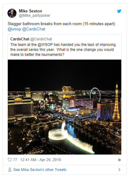 如果你还没有参加过WSOP赛事,特别是大阵容的锦标赛,那么你是不会知道里奥会议中心卫生间的拥挤程度的。长长的队伍迫使很多选手“憋到”午休时间,Mike Sexton对此提出了一个解决方案。