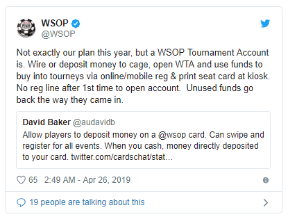 Jasper Meijer van Putten (@jaspermvp)抱怨的是排长队报名,他建议凯撒所有娱乐城开放WSOP报名。这样不仅减少了里奥酒店柜台的工作,还给参赛选手带来了不少方便。