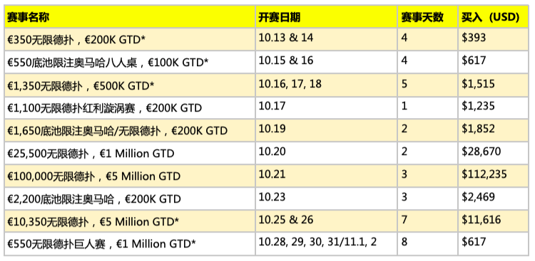 这次值得大家期待的有两项金手链赛事:500万欧元保底奖池的€10,350买入WSOP-E无限德扑主赛(10月25-31日)和500万欧元保底奖池的€100,000买入超高额豪客赛(10月23-25日)。